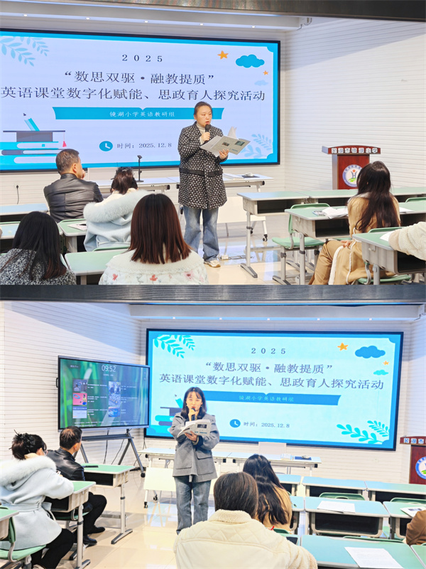 近日,镜湖小学以“数思双驱·融教提质”为主题的英语课堂数字化赋能与思政育人探究活动圆满落幕。活动分上下两场开展:12月5日上半场聚焦课堂实践,由王丽娟、朱裕萍两位教师展示两节数字化英语课堂;12月8日下半场聚焦教研研讨,通过教学反思、集中评课、主题探讨及校长点评,凝聚教学智慧,明晰育人方向,为学校英语教学创新注入动力。